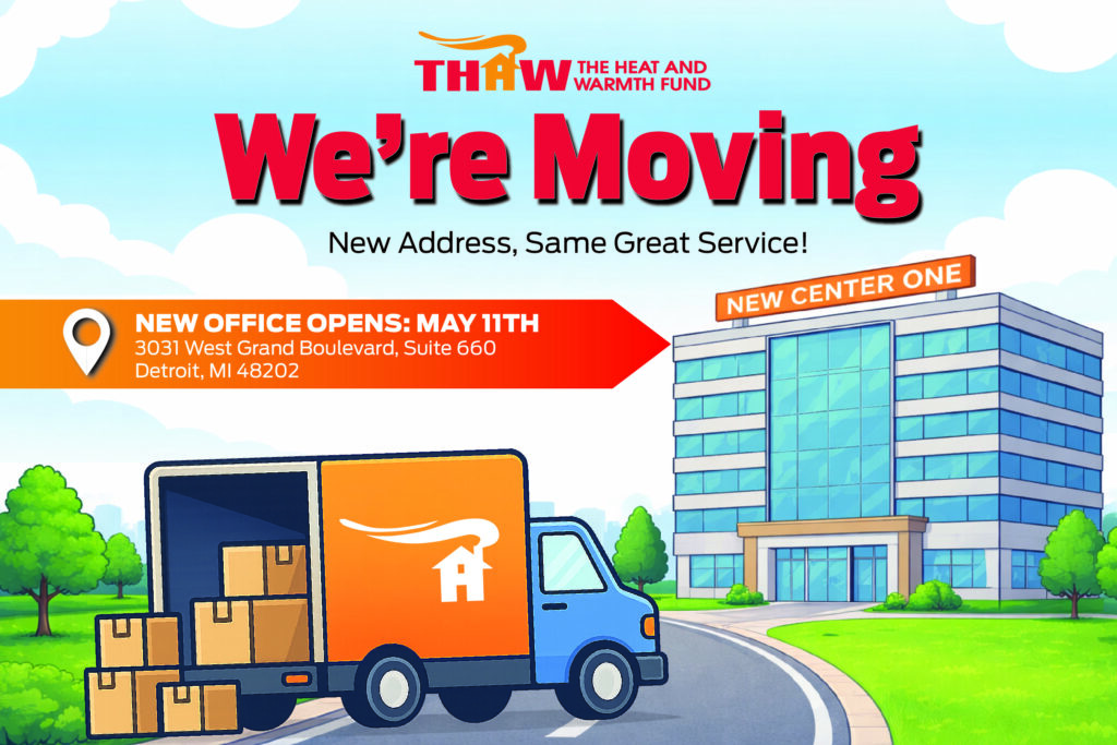 New Address, Same Great Service! The Heat and Warmth Fund (THAW) is relocating our service office to better serve you. LAST DAY AT CURRENT LOCATION: April 16, 2026 NEW OFFICE OPENS: Friday, May 11th 3031 West Grand Boulevard, Suite 660, Detroit, MI 48202 Questions? We’re here to help, call or text 800-866-THAW(8429).
